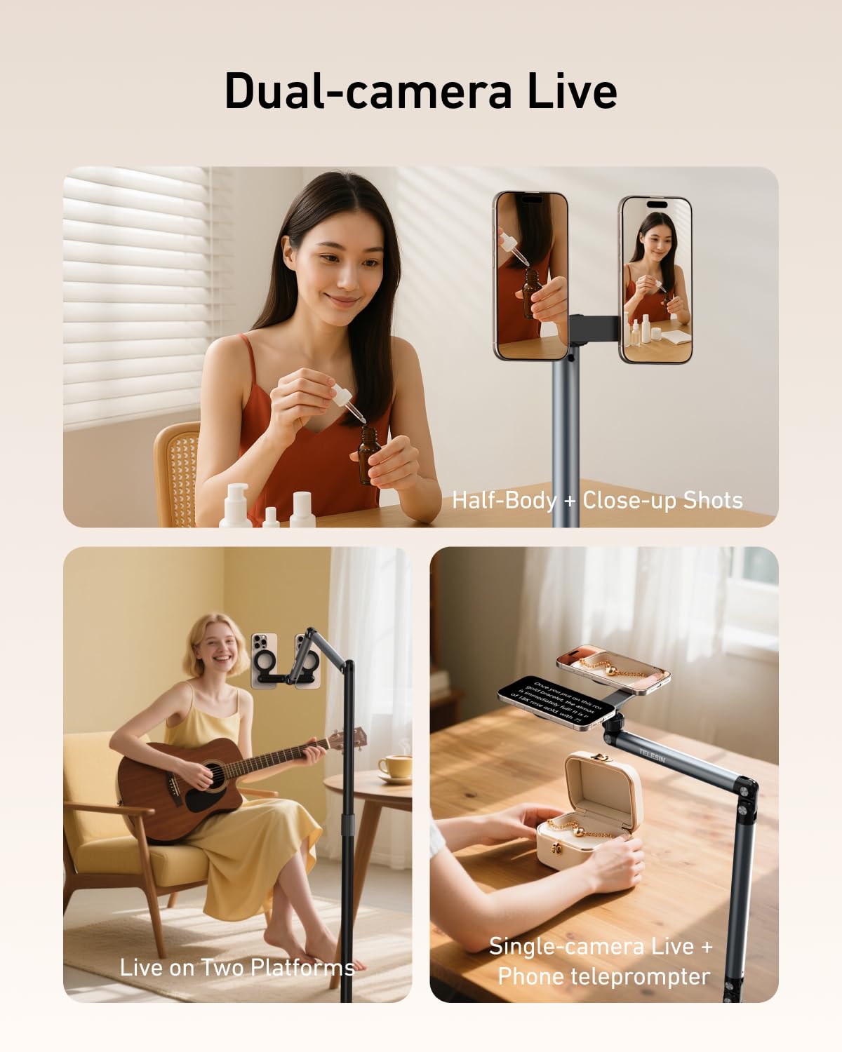 - 🧲 【Dual-Position MagneticTablet Floor Stand】2-Device Simultaneous Streaming Industry-first dual magnetic mounts hold any iPhone + tablet or dual phones (Android/iOS)—includes bouns 2 magnetic rings for non-Magnetic devices. Perfect for multi-angle live sales, reaction videos, or split-screen Zoom meetings with zero adapter clutter.