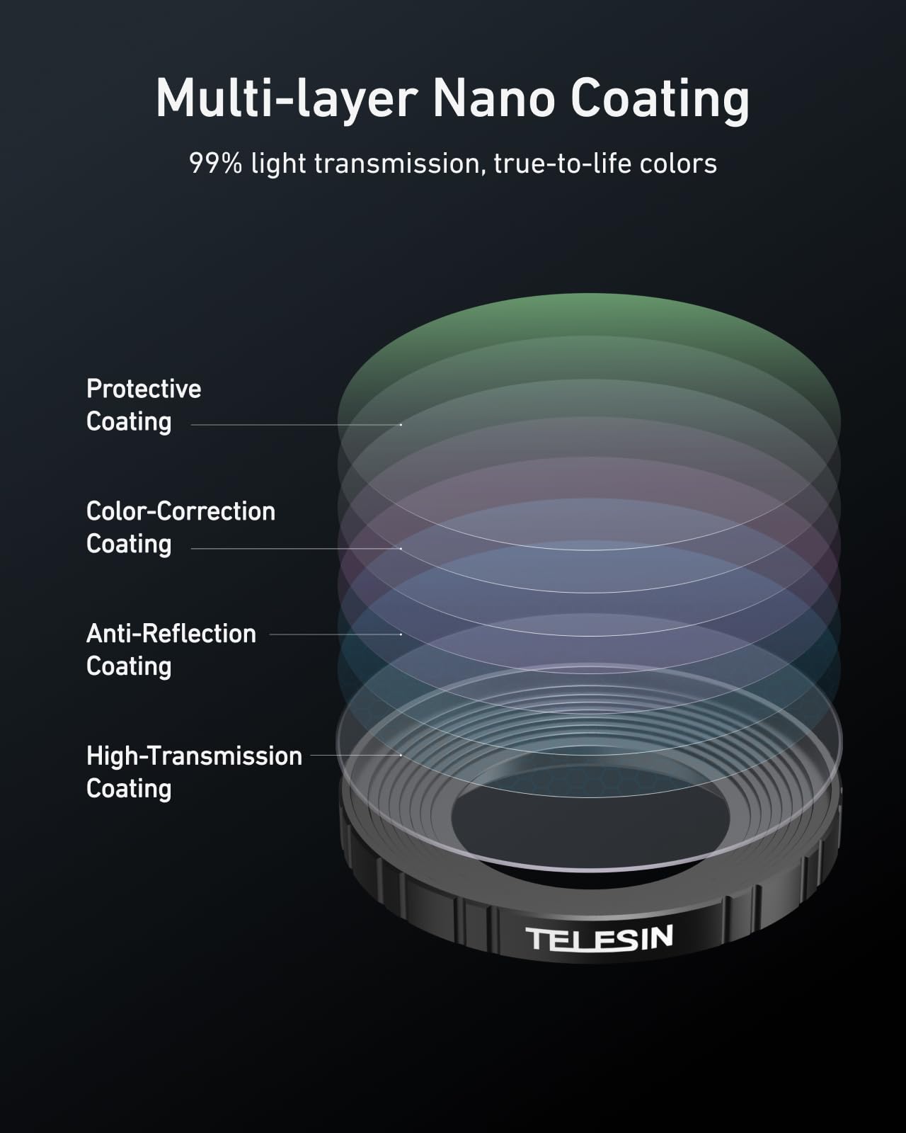 - 【Cinematic Black Diffusion 1/4 Effect】TELESIN Black Diffusion 1/4 filter for DJI Osmo Nano gently softens image details, reduces harsh highlights, and adds a subtle cinematic glow—ideal for portraits, backlight, night scenes, and vlog shooting.