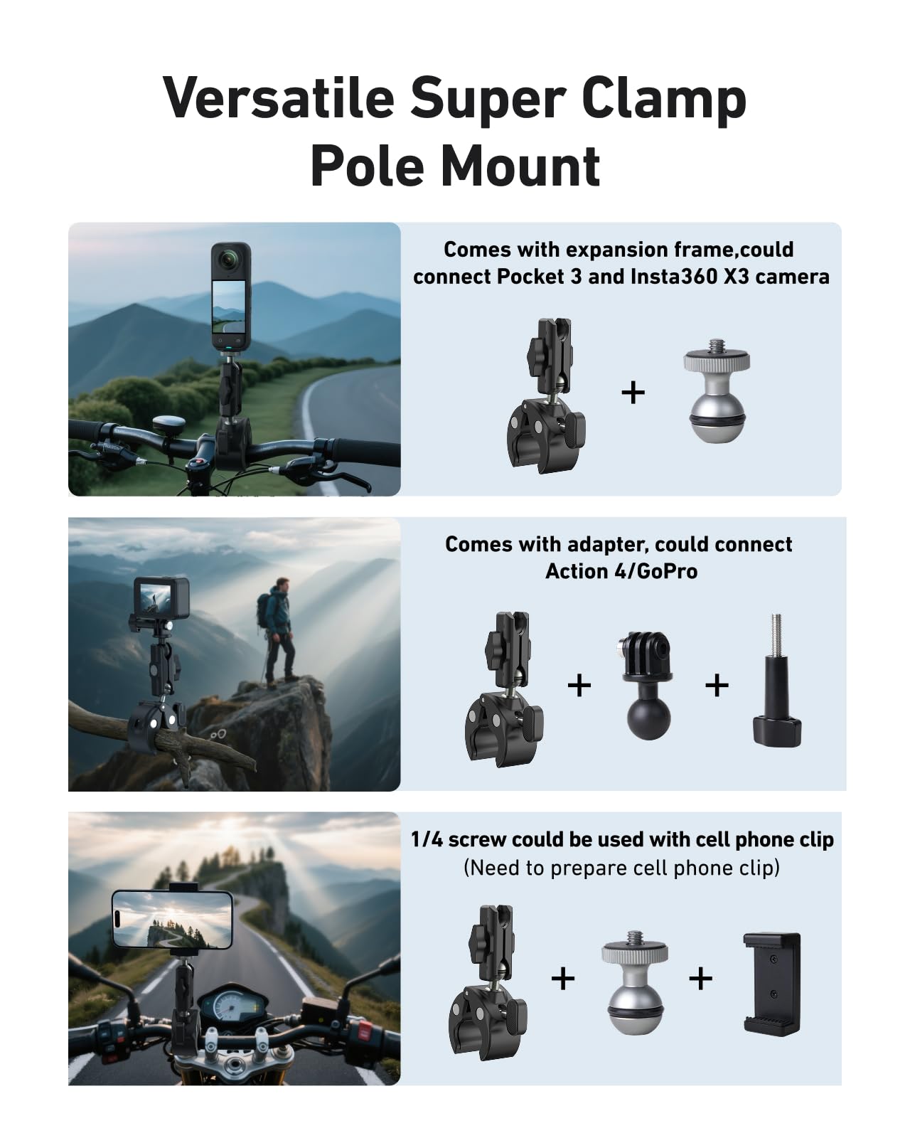 TELESIN Camera Clamp Mount Bike Motorcycle Handlebar Mounts Accessories, 360 Ball Joint Tube Roll Bar Holder Clip for DJI Osmo Pocket 4/DJI Osmo Action 6/Action 5 4 Pro/Hero 13 12 11 10 9/Insta 360 X5