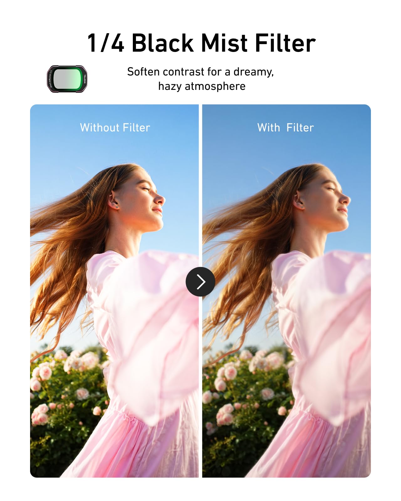 - 【ND, CPL, Black Mist & Cool Rose – All-in-One Filter Kit】Complete lens filter set for professional shooting: VND 2–32 ND Filter: Control exposure in bright light, achieve cinematic shutter speed and motion blur, CPL Filter: Reduce glare, reflections, and boost color saturation for outdoor scenes, 1/4 Black Mist Filter: Create soft cinematic glow, reduce highlights for portraits and videos, Cool Rose Filter: Add stylish cool tone and soft pink tint for aesthetic vlog and lifestyle content.