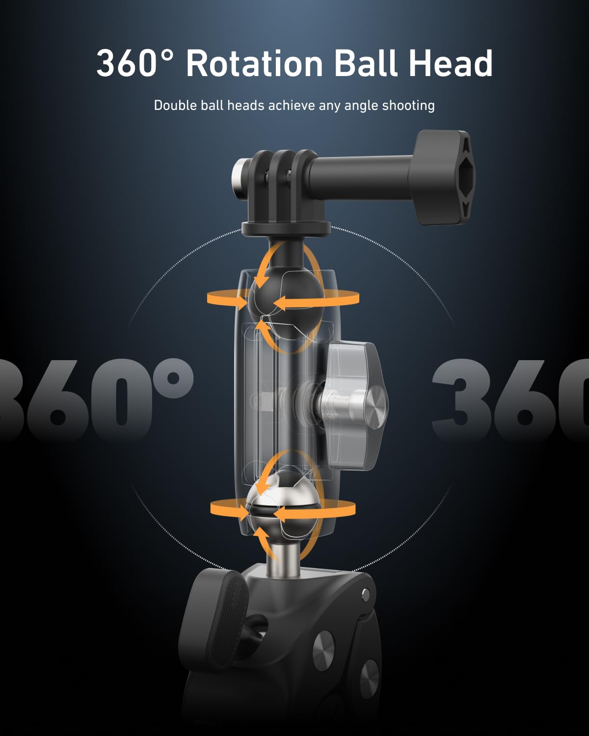 - 【360 Ball Head Rotation】 This super camera clamp mount adopts 360 ball head design, the upper and lower parts can be adjusted 360 degrees at will to adjust the shooting direction, the clamping is more stable, and will not be offset or loose. There is no need to worry about stability even for long periods of movement, riding or static clamping.