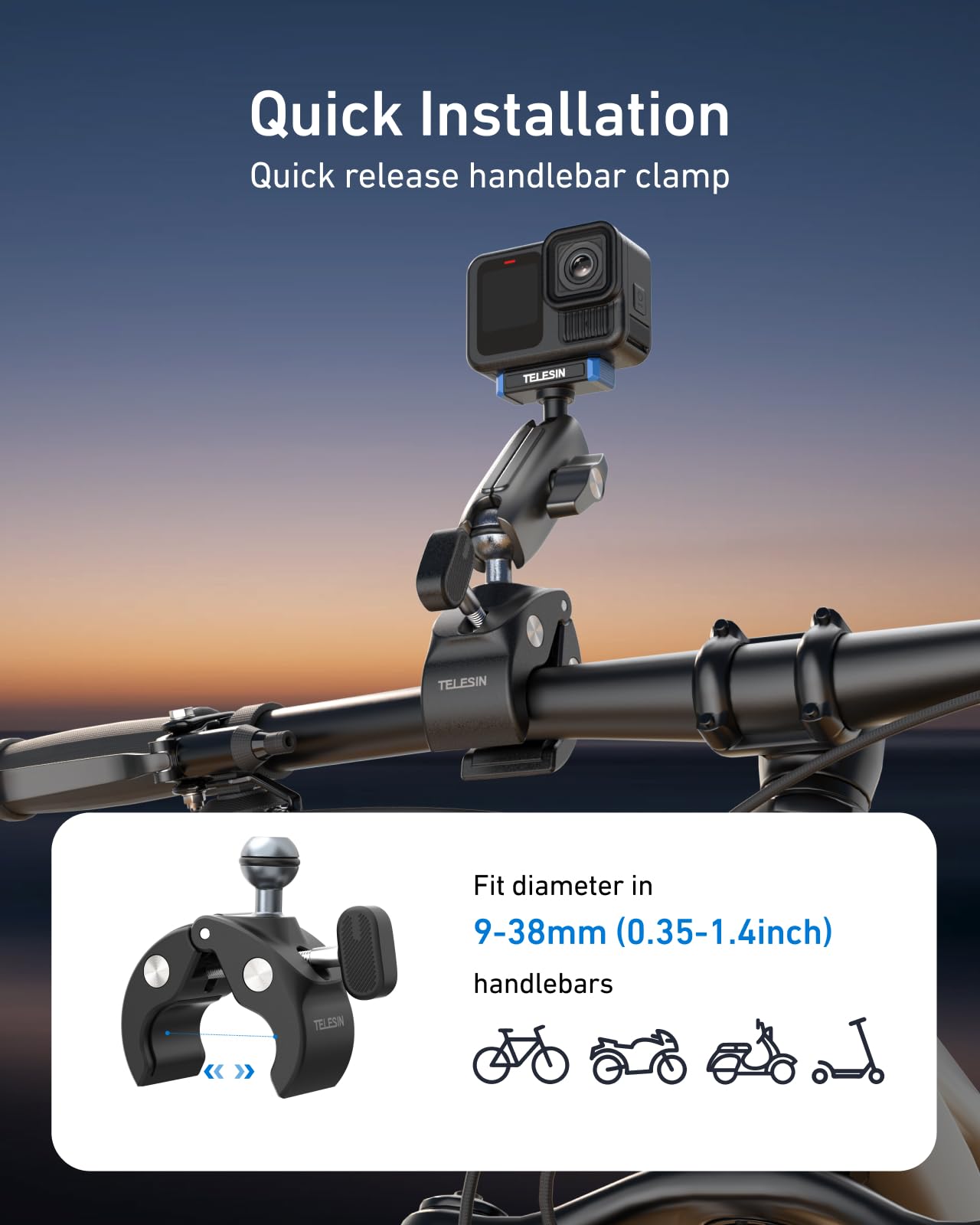 TELESIN Super Clamp Mount | Bike Handlebar Mount for Hero 13 | Power Suction Magnetic Design | 360° Rotation Ball Head | Fits 9-38mm Handlebar for Bike/Bicycle/Motorcycle