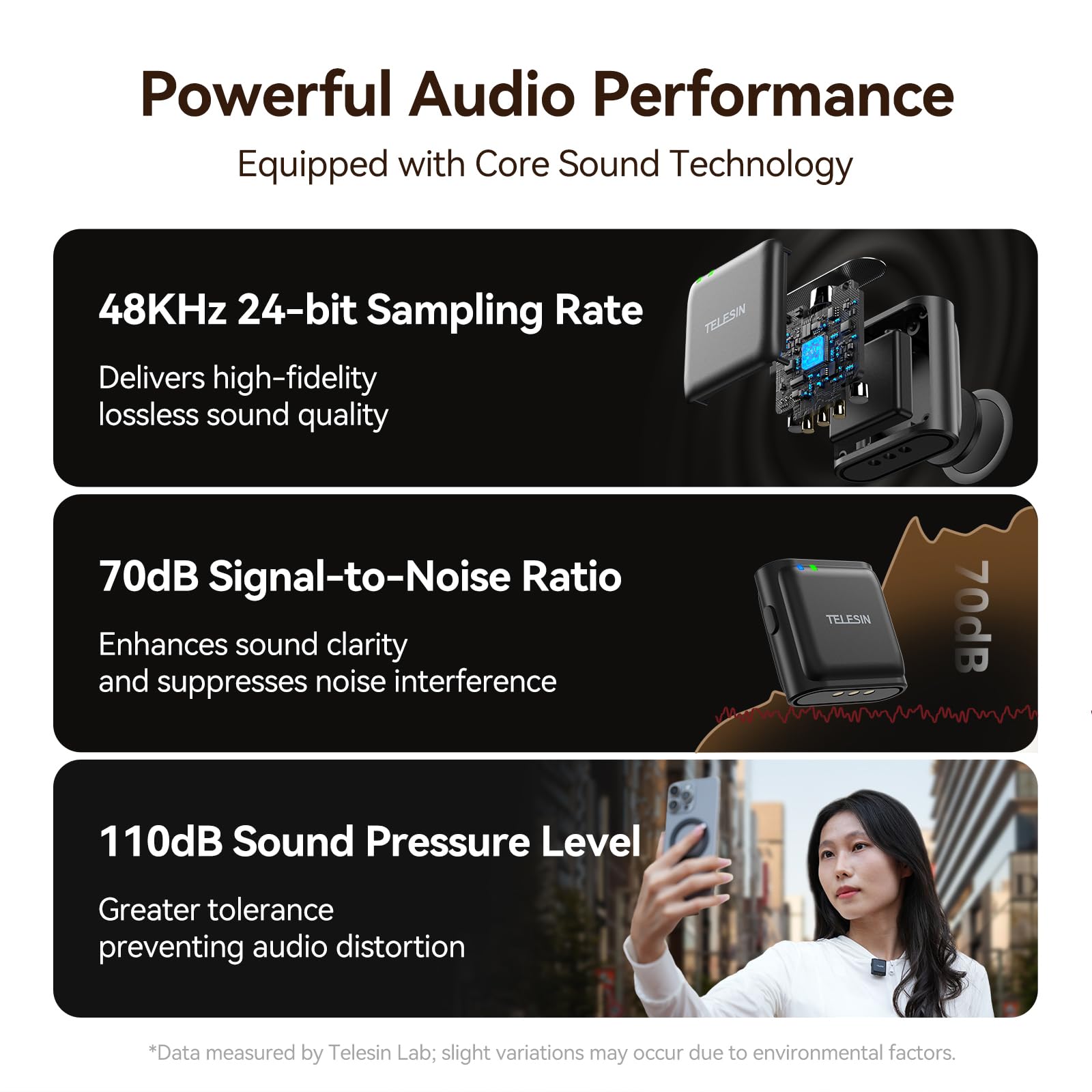 - Pure sound quality with one-click noise reduction - The TELESIN wireless clip-on microphone features a 48KHz 24-bit sampling rate and one-touch noise cancellation. With a 70dB signal-to-noise ratio, it enhances sound purity by reducing interference, while its 110dB sound pressure level ensures exceptional tolerance for distortion-free audio, even at high volumes
